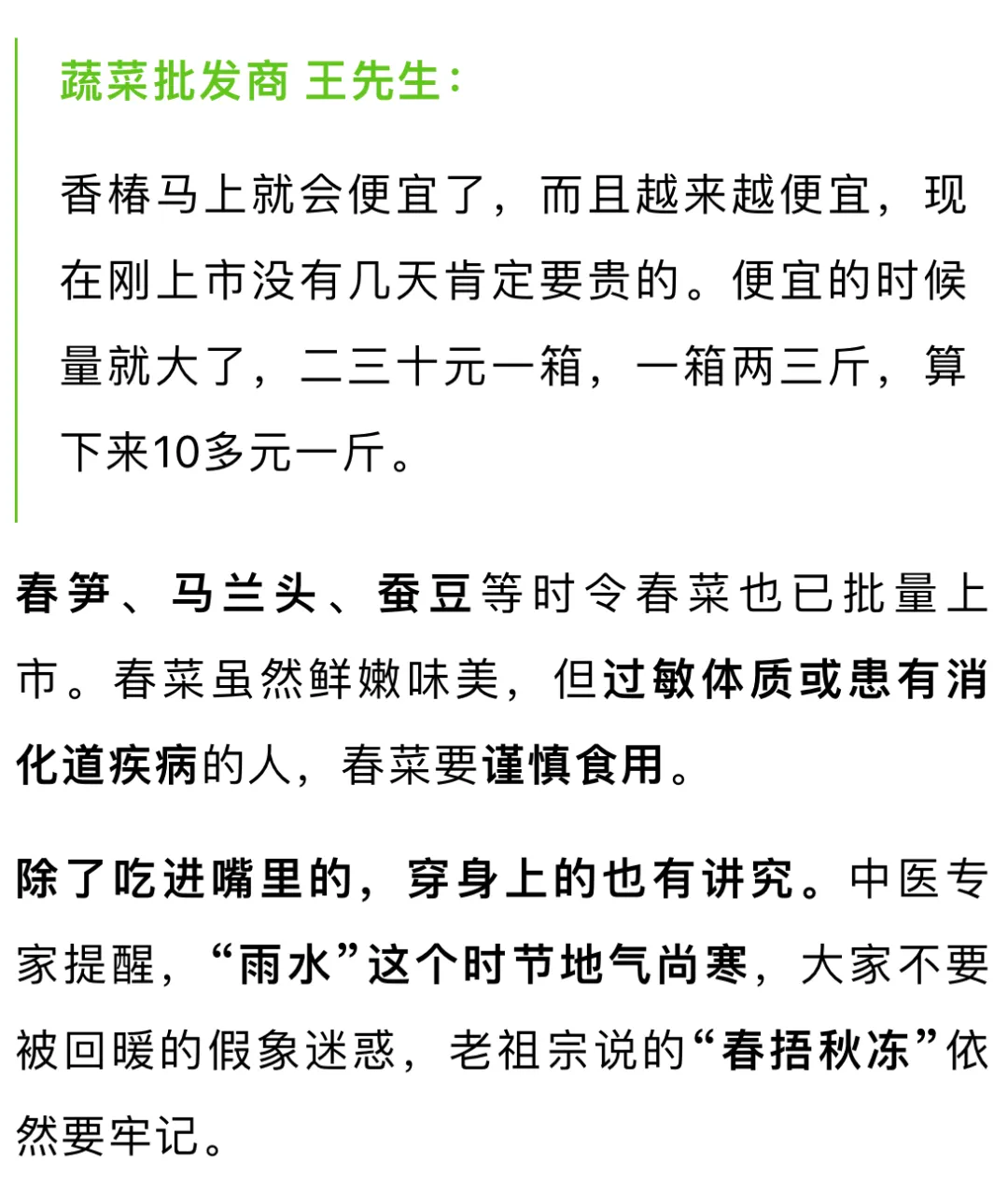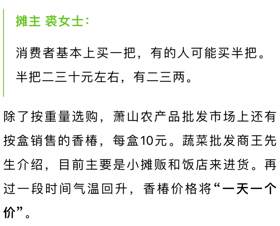 “雨水”的到来,意味着天气回暖,降雨增多,各种鲜香味美的春菜 也纷纷上市,最顶流的当属香椿。 香椿现在价格如何,吃春菜又有什么讲究?